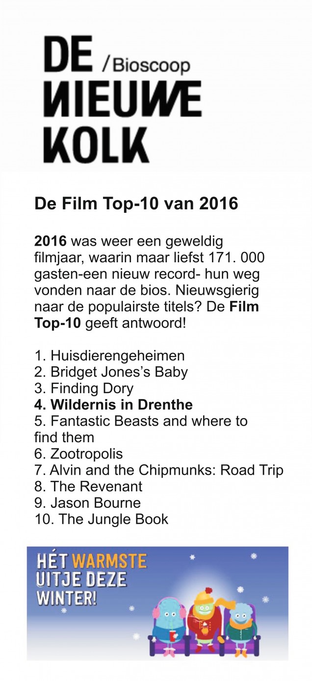 Na slechts twee weken te hebben gedraaid staat WILDERNIS IN DRENTHE in het gehele jaaroverzicht al op de keurige 4e plaats. De tweede rond voorstellingen moest toen nog komen!